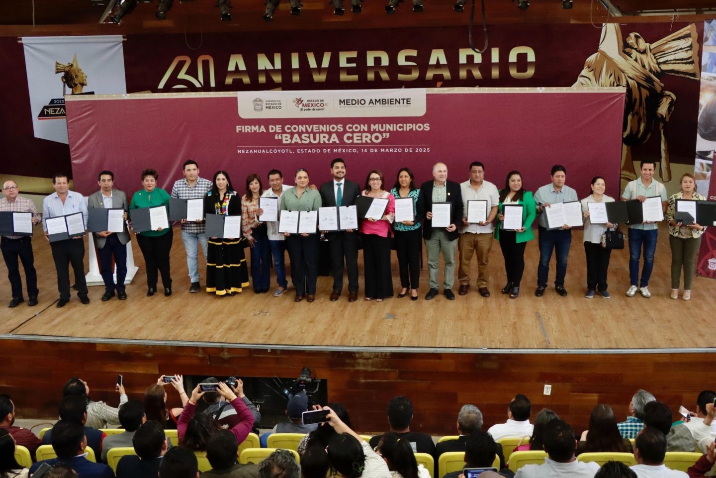 CHIMALHUACAN, MÉX., a 15 de marzo de 2025.- Con el objetivo de avanzar en el manejo integral de residuos y en el cumplimiento de las normativas ambientales establecidas en el Plan de Desarrollo 2023-2029, la presidenta municipal, Xóchitl Flores Jiménez, junto con alcaldes y alcaldesas de 13 diferentes municipios del Estado de México, firmó importantes convenios de colaboración con la Secretaría del Medio Ambiente y Desarrollo Sostenible del Estado de México, en el marco de la iniciativa "Basura Cero".