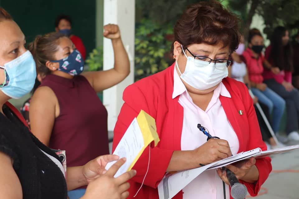 La postulante tricolor visitó las colonias Arboledas y Acuitlapilco, donde los habitantes plantearon diversas demandas, entre ellas el equipamiento para sanitización del Centro Escolar Mártires 18 de agosto y el preescolar Humberto Gutiérrez.